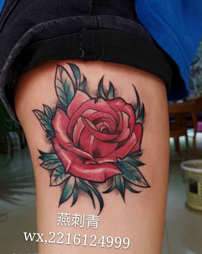 大腿玫瑰花纹身图片_腿部成品纹身图案