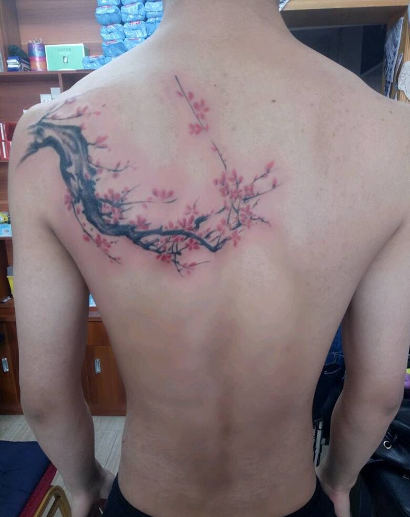 背后梅花纹身图片_背部传统植物成品纹身图案