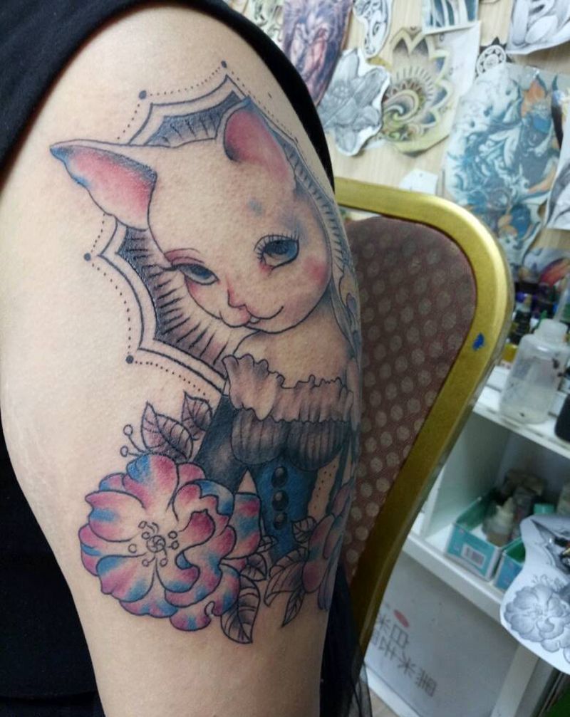 当前位置: 首页 >云南省昆明市纹身店-冯琦刺青纹身图案>大臂欧美猫与花花~纹身图片_手臂欧美清新动物人物成品纹身图案