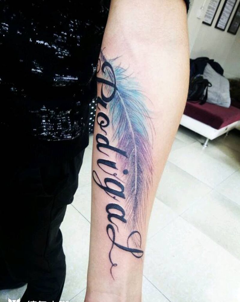 当前位置: 首页 >云南省昆明市纹身店-冯琦刺青纹身图案>小臂羽毛与字母纹身图片_手臂手部欧美清新动物静物成品纹身图案