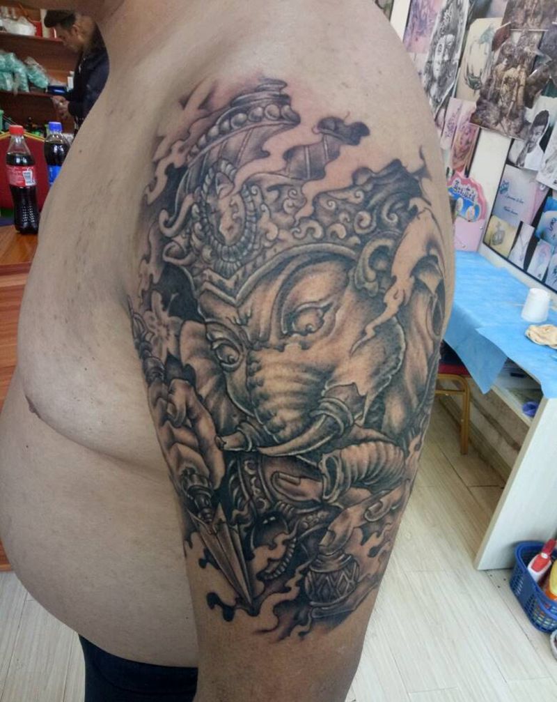 当前位置: 首页 >云南省昆明市纹身店-冯琦刺青纹身图案>大臂象神纹身图片_肩部传统人物鬼神成品纹身图案