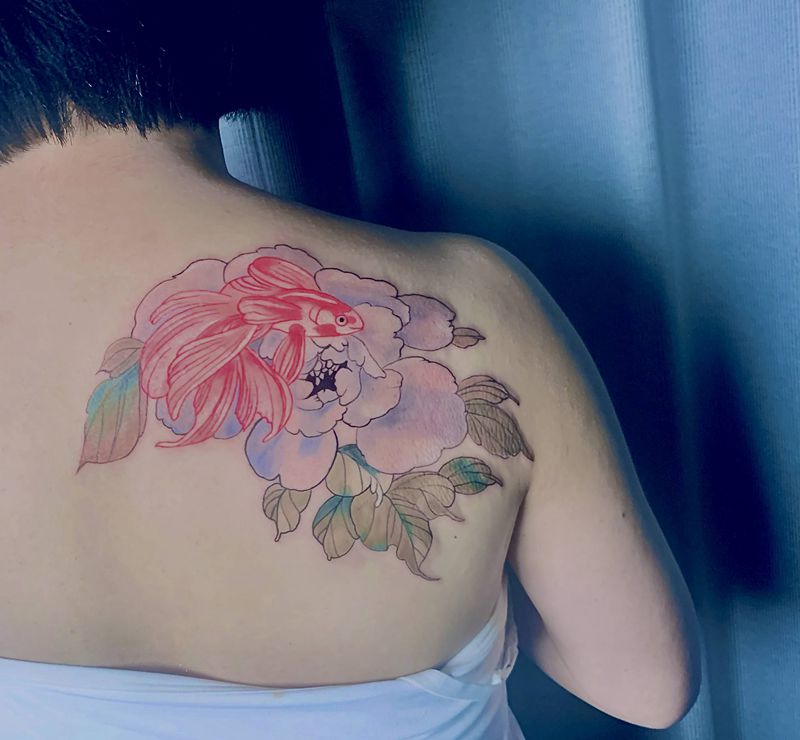 当前位置: 首页 >云南省昆明市纹身店-如也·刺青Tattoo Studio纹身图案>金鱼与花纹身图片_肩部背部水彩水墨纹身图案