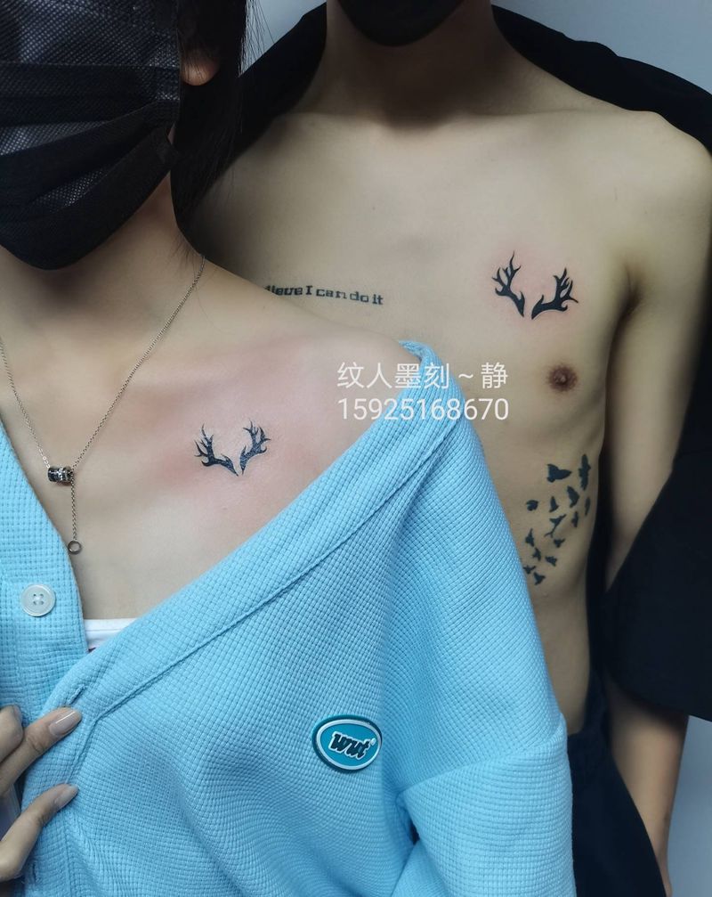 当前位置: 首页 >云南省昆明市纹身店-昆明 纹人墨刻刺青纹身图案>情侣鹿角纹身图片_肩部胸部图腾小清新情侣纹身图案