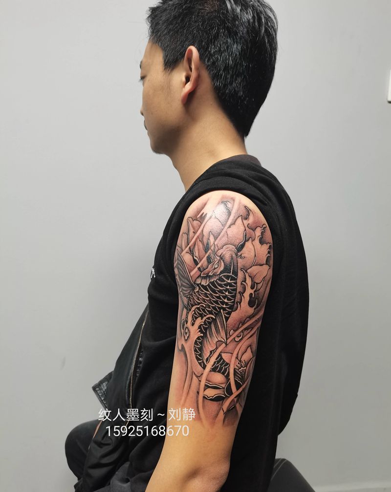 当前位置: 首页 >云南省昆明市纹身店-昆明 纹人墨刻刺青纹身图案>锦鲤纹身图片_手臂手部新传统黑灰锦鲤纹身图案