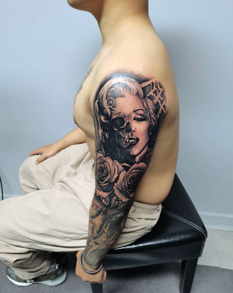 当前位置: 首页 >云南省昆明市纹身店-昆明 纹人墨刻刺青纹身图案>梦露纹身图片_手臂欧美写实花臂纹身图案