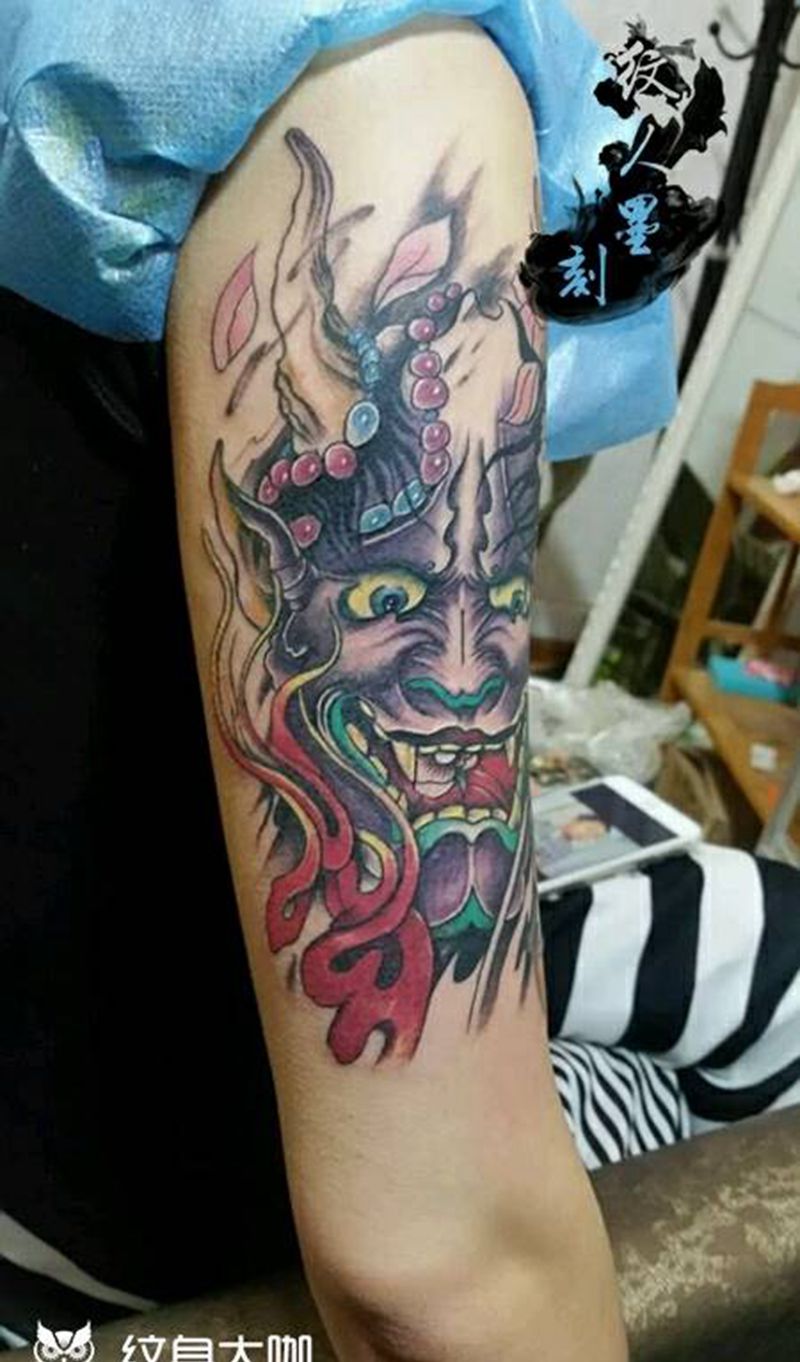 大臂般若纹身图片_手臂传统鬼神昆明云南纹人墨刻成品纹身图案