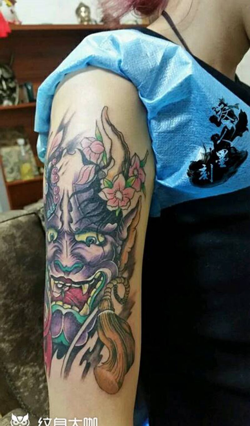 大臂般若纹身图片_手臂传统鬼神昆明云南纹人墨刻成品纹身图案