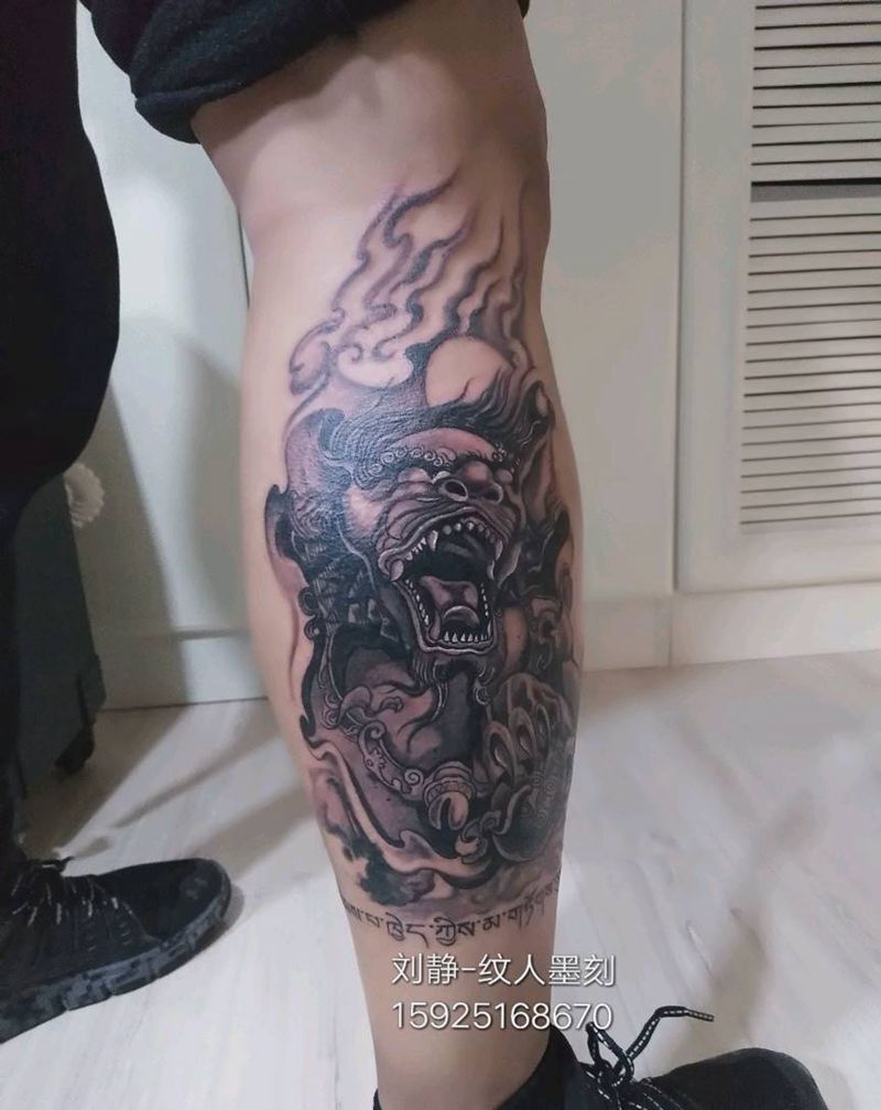 当前位置: 首页 >云南省昆明市纹身店-昆明 纹人墨刻刺青纹身图案>唐狮纹身图片_腿部传统动物昆明云南纹人墨刻成品纹身图案