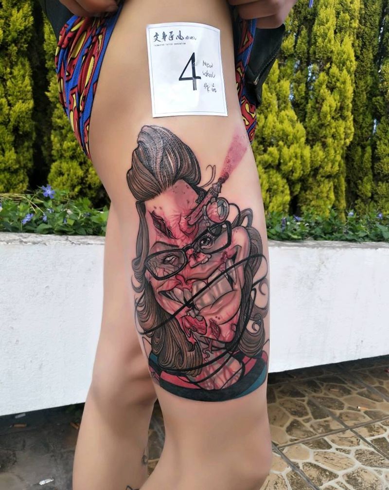 获奖作品纹身图片_腿部欧美人物昆明云南纹人墨刻成品纹身图案