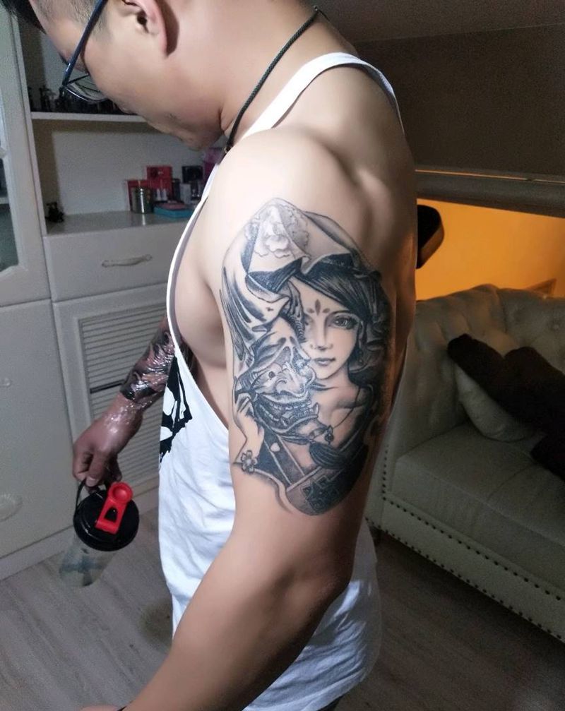 当前位置: 首页 >云南省昆明市纹身店-昆明 纹人墨刻刺青纹身图案>两年前的作品纹身图片_手臂传统人物昆明云南纹人墨刻成品纹身图案
