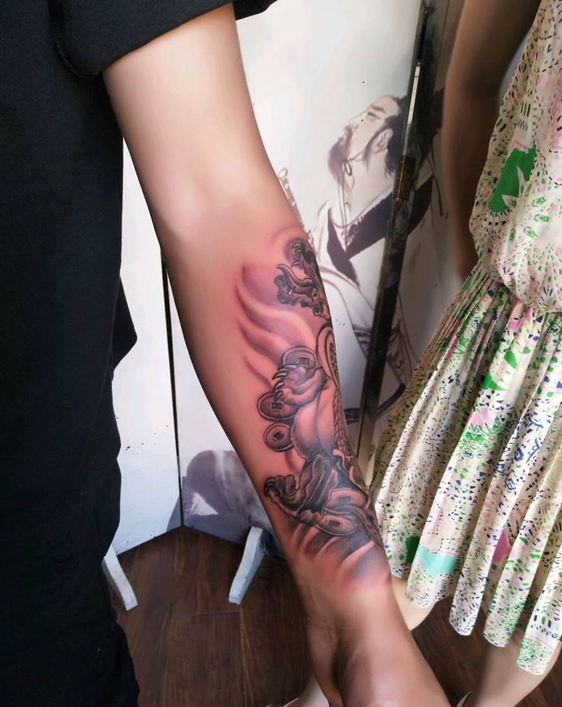 麒麟纹身图片_手臂传统鬼神昆明云南纹人墨刻修改遮盖成品纹身图案