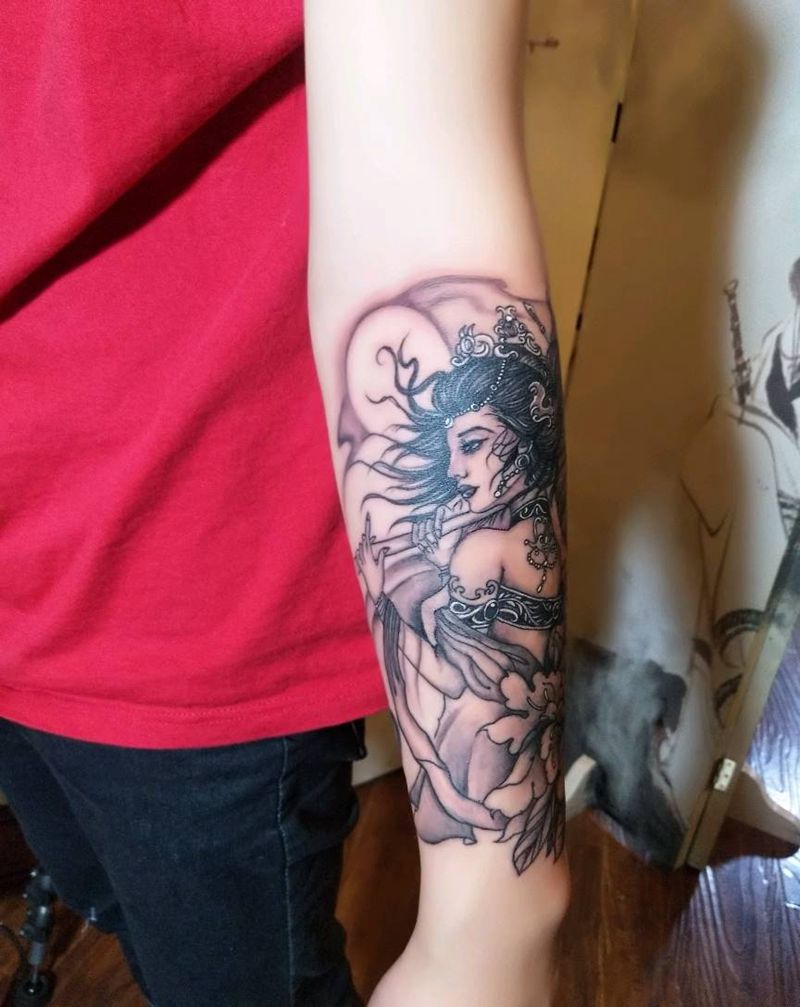 当前位置: 首页 >云南省昆明市纹身店-昆明 纹人墨刻刺青纹身图案>艺妓纹身图片_手臂传统人物昆明云南纹人墨刻修改成品纹身图案