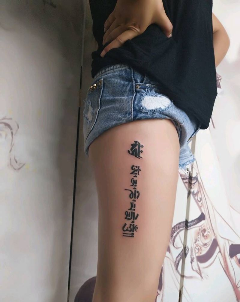 当前位置: 首页 >云南省昆明市纹身店-昆明 纹人墨刻刺青纹身图案>小图组纹身图片_腿部花体字新传统小图藏文梵文纹身图案
