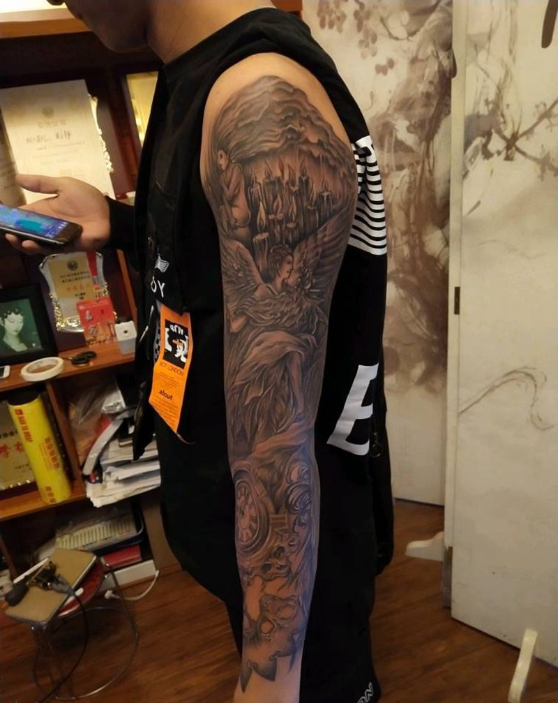 欧美花臂,完工了纹身图片_背部欧美写实花臂纹身图案