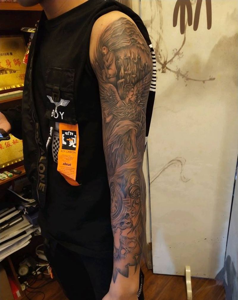 欧美花臂,完工了纹身图片_背部欧美写实花臂纹身图案