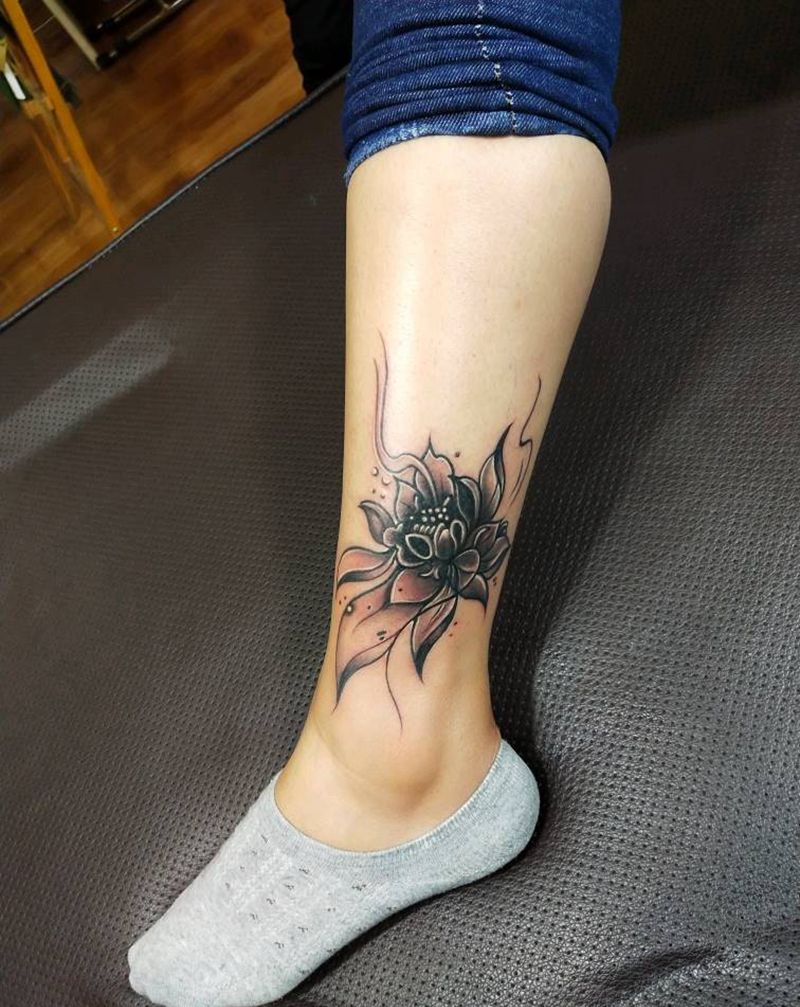 荷花纹身图片_腿部水墨遮盖纹身图案