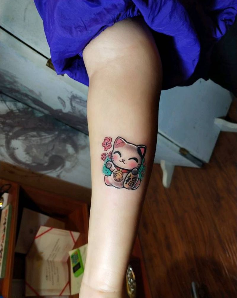 招财猫纹身图片_手部水彩小卡通招财纹身图案