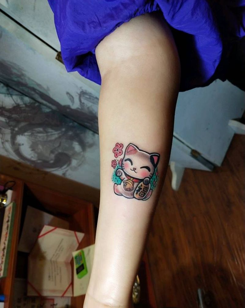 招财猫纹身图片_手部水彩小卡通招财纹身图案
