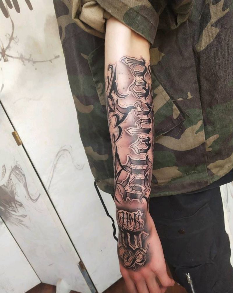 当前位置: 首页 >云南省昆明市纹身店-昆明 纹人墨刻刺青纹身图案>奇卡诺字体纹身图片_手臂花体字纹身图案