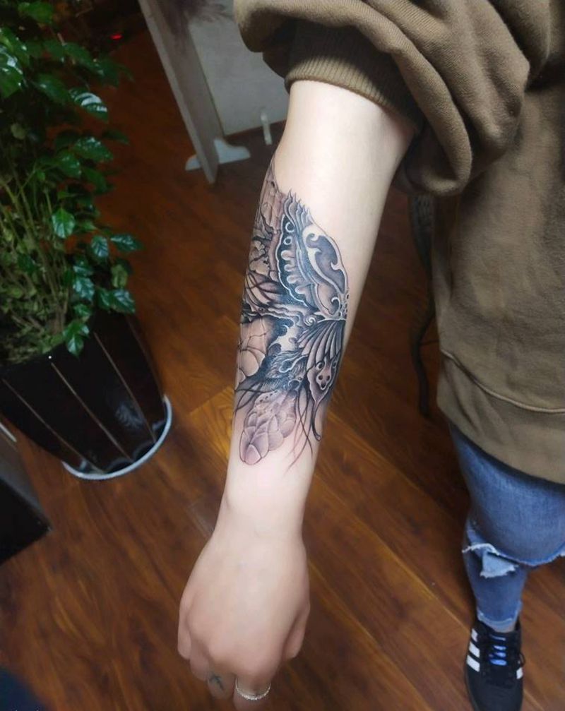 蝴蝶纹身图片_手臂水墨写实纹身图案