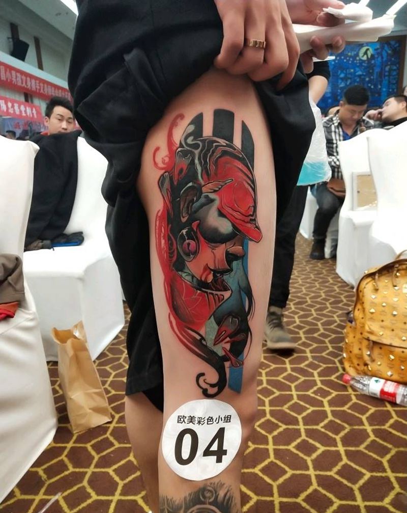 当前位置: 首页 >云南省昆明市纹身店-昆明 纹人墨刻刺青纹身图案>沉思纹身图片_腿部New School纹身图案