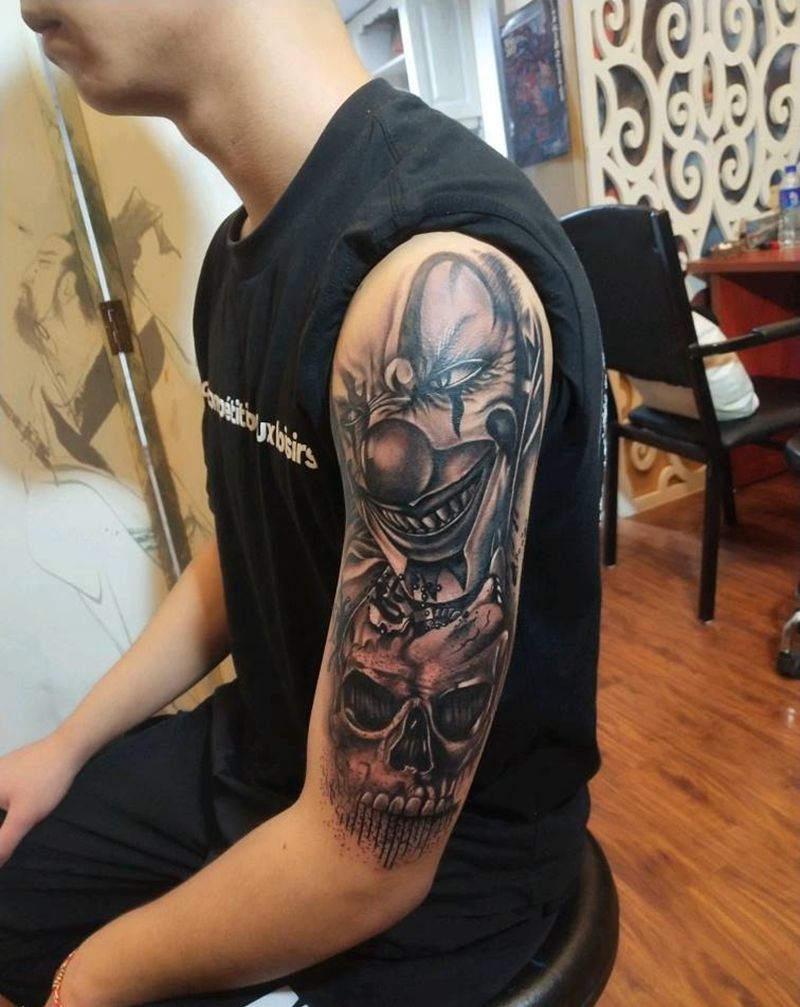 当前位置: 首页 >云南省昆明市纹身店-昆明 纹人墨刻刺青纹身图案>小丑骷髅纹身图片_手臂欧美写实纹身图案