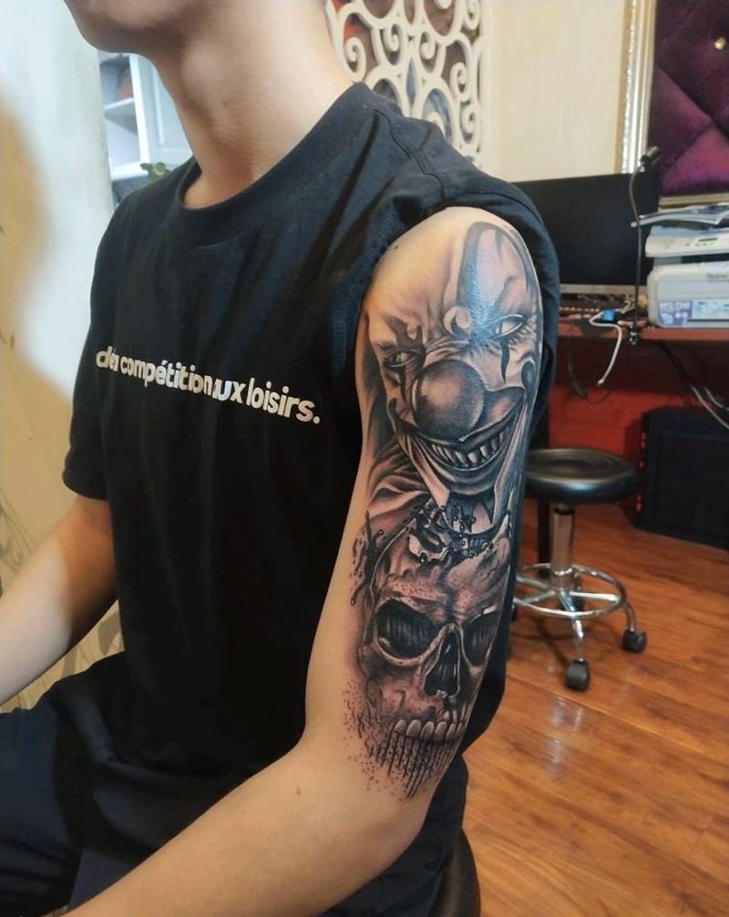 当前位置: 首页 >云南省昆明市纹身店-昆明 纹人墨刻刺青纹身图案>小丑骷髅纹身图片_手臂欧美写实纹身图案