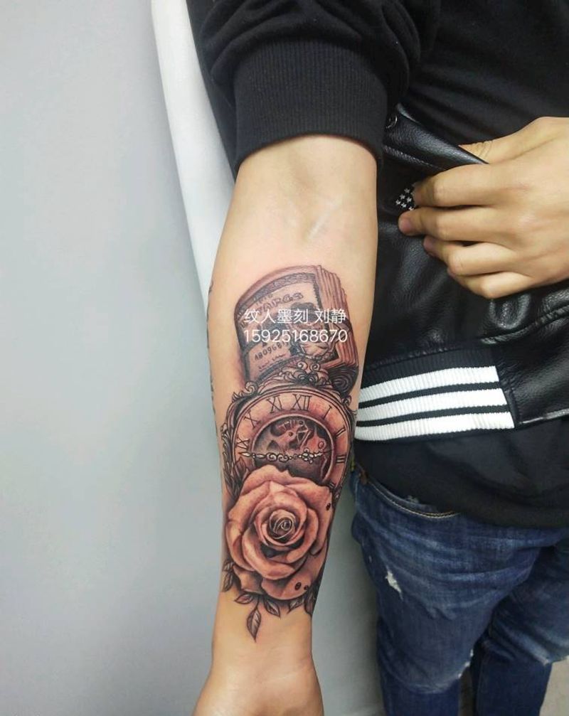 时间,爱情,金钱纹身图片_手臂欧美写实写实纹身图案