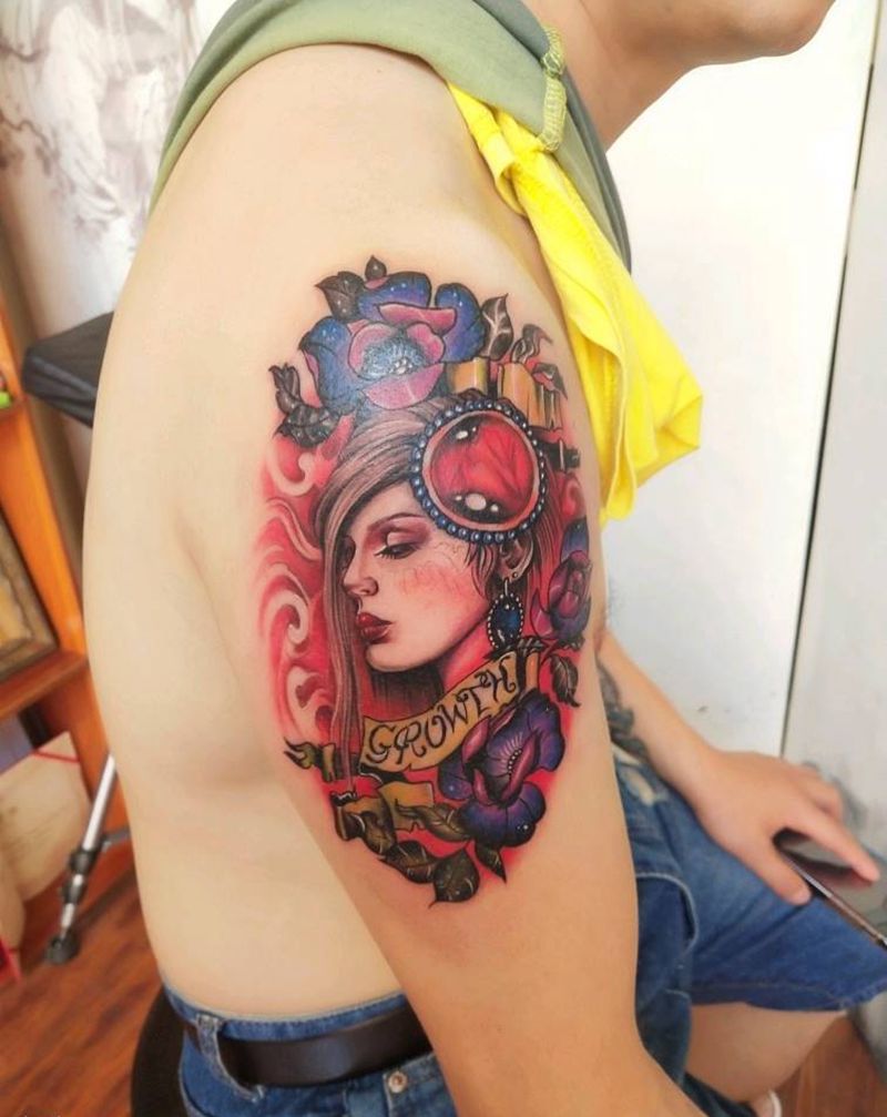 当前位置: 首页 >云南省昆明市纹身店-昆明 纹人墨刻刺青纹身图案>女郎纹身图片_手臂New School彩色纹身图案