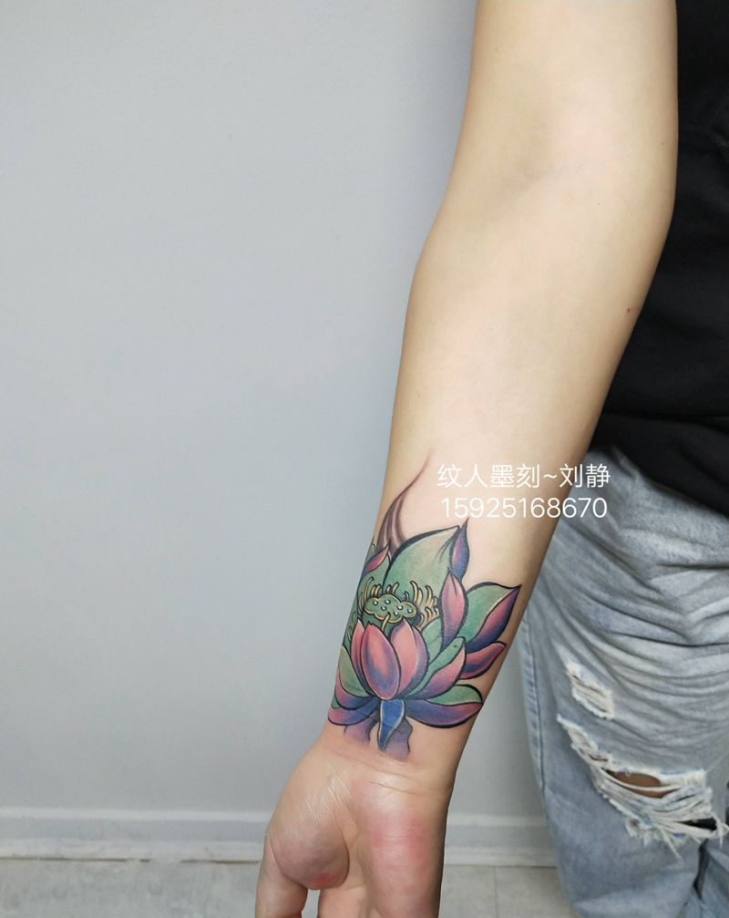 荷花纹身图片_手臂新传统水彩纹身图案