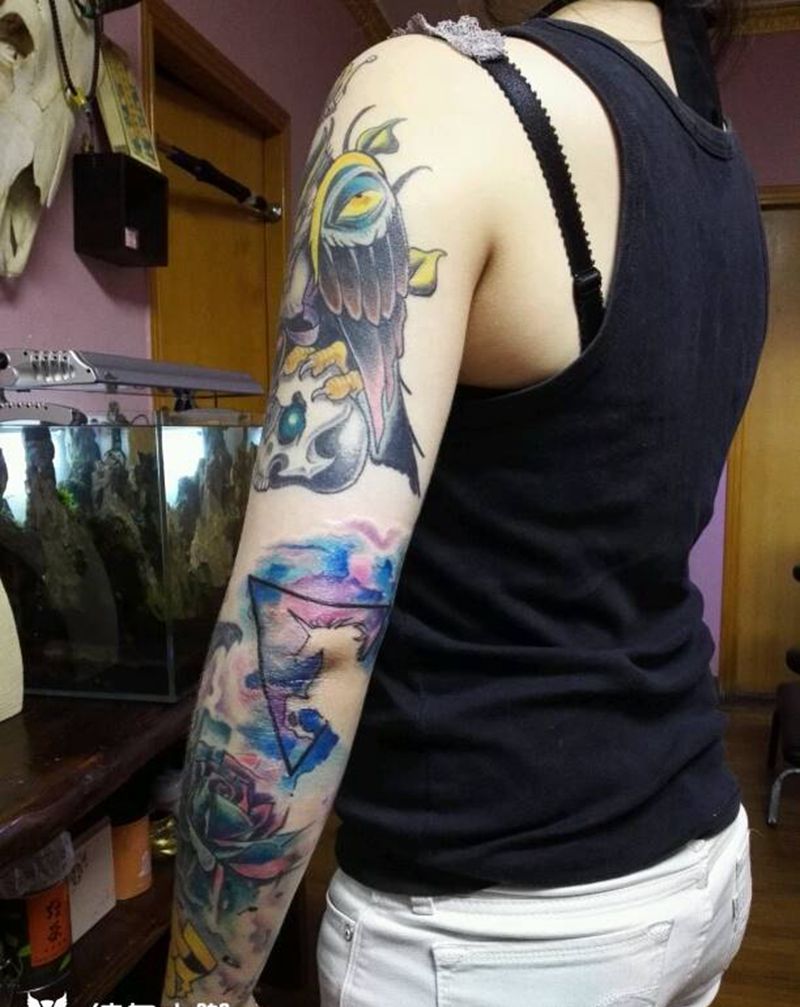 New school 美女花臂纹身图片_手臂欧美动物原创成品纹身图案