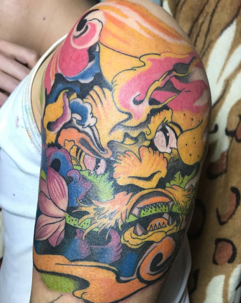 • T网红王老大花腿龙纹身图片_腿部新传统纹身图案