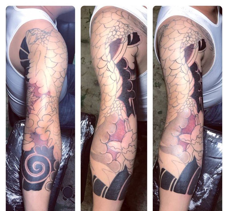 • T网红王老大花腿龙纹身图片_腿部新传统纹身图案