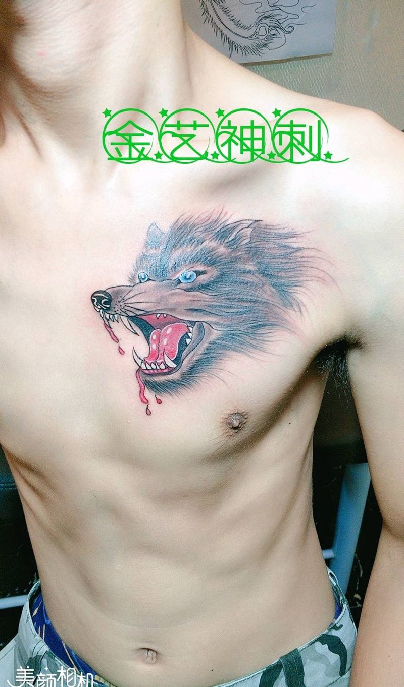 胸口 滴血 狼头纹身图片_胸部传统动物成品纹身图案