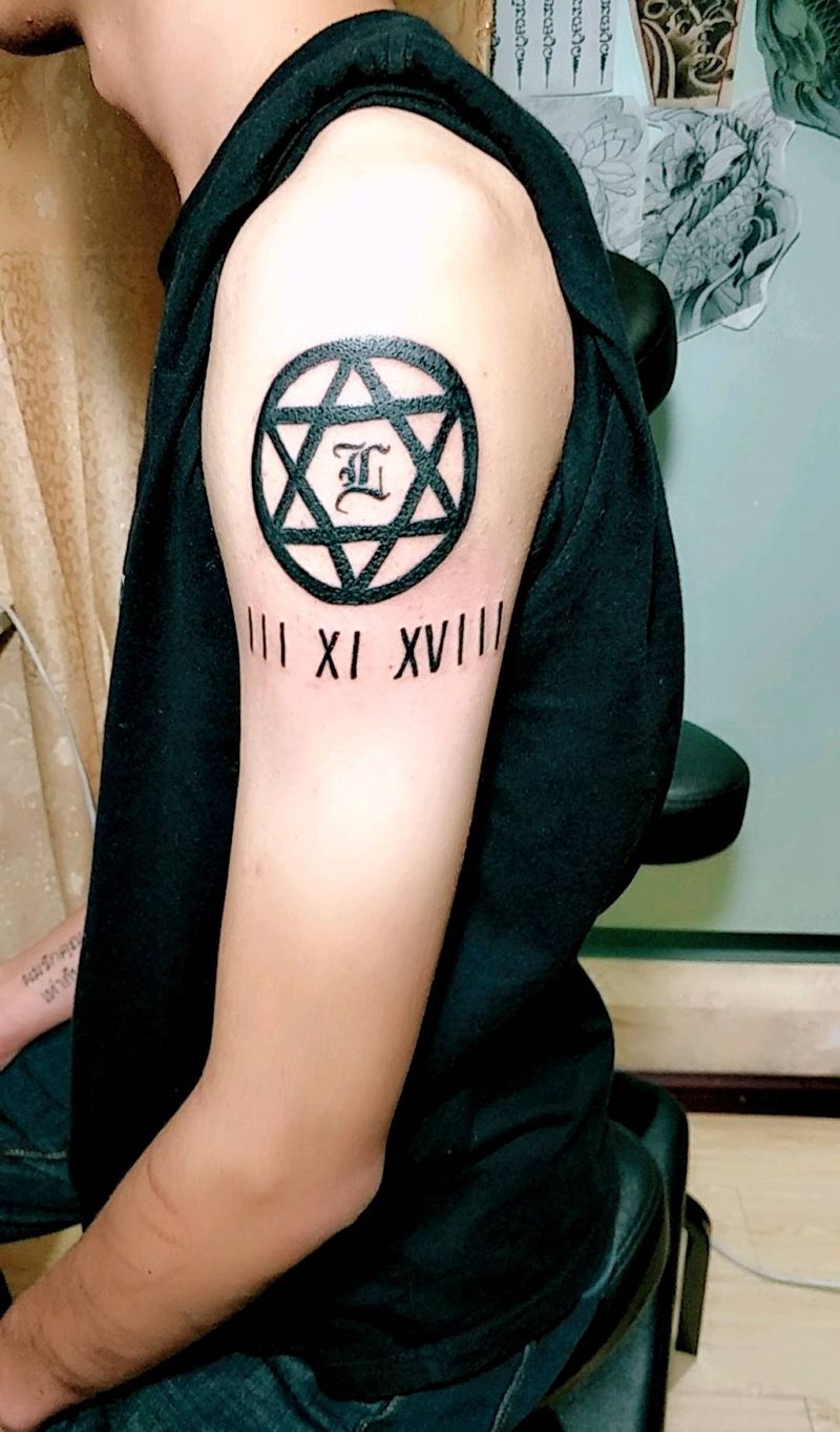 当前位置: 首页 >云南省曲靖市纹身店-金艺神刺工作室纹身图案>六芒星 罗马数字 花体字纹身图片_手臂写实字符图腾原创成品纹身图案