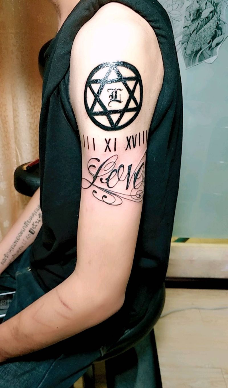 当前位置: 首页 >云南省曲靖市纹身店-金艺神刺工作室纹身图案>六芒星 罗马数字 花体字纹身图片_手臂写实字符图腾原创成品纹身图案