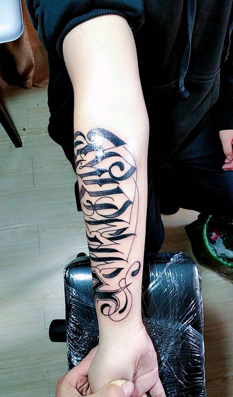 当前位置: 首页 >云南省曲靖市纹身店-金艺神刺工作室纹身图案>花体字纹身图片_手臂花体字纹身图案
