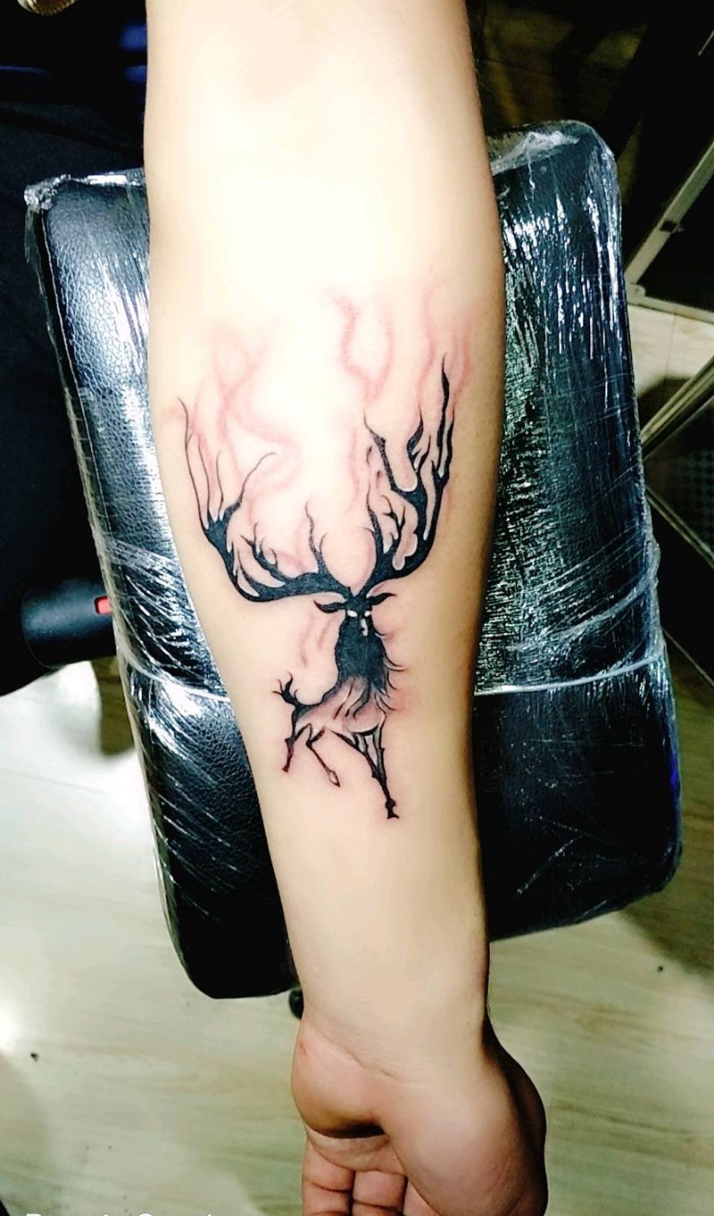 当前位置: 首页 >云南省曲靖市纹身店-金艺神刺工作室纹身图案>小鹿纹身图片_手臂水墨新传统纹身图案