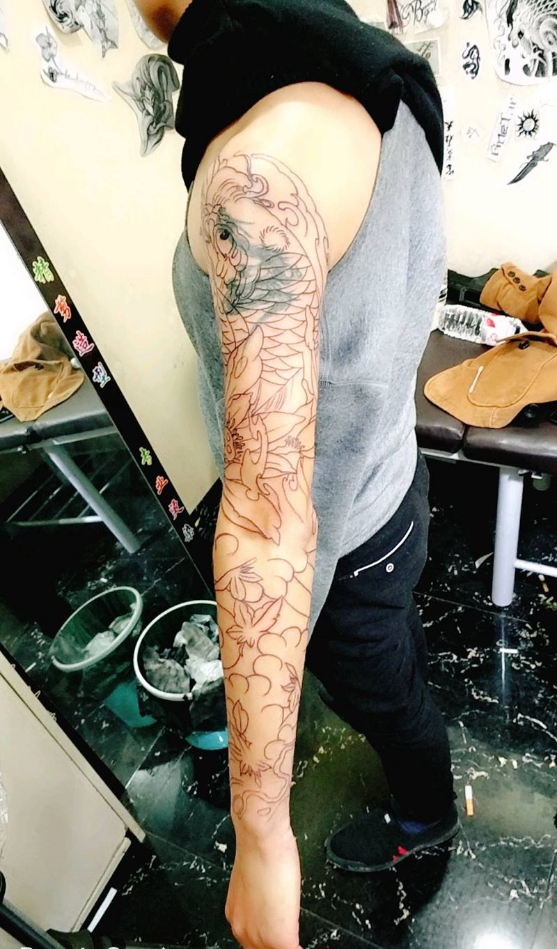 当前位置: 首页 >云南省曲靖市纹身店-金艺神刺工作室纹身图案>花臂 线条完成纹身图片_手臂新传统纹身图案