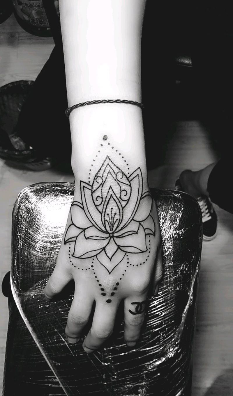当前位置: 首页 >云南省曲靖市纹身店-金艺神刺工作室纹身图案>几何莲花纹身图片_手部点刺几何纹身图案