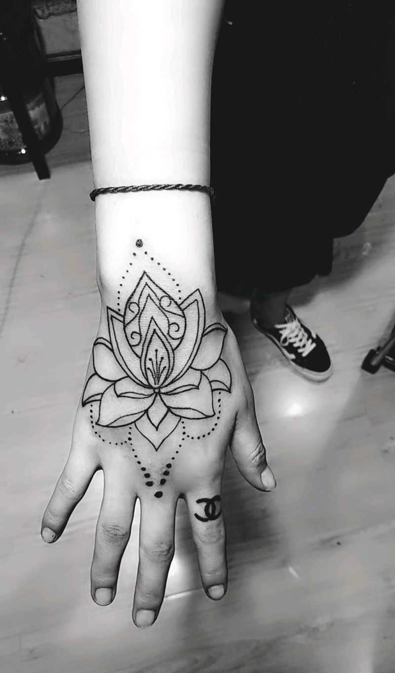 当前位置: 首页 >云南省曲靖市纹身店-金艺神刺工作室纹身图案>几何莲花纹身图片_手部点刺几何纹身图案