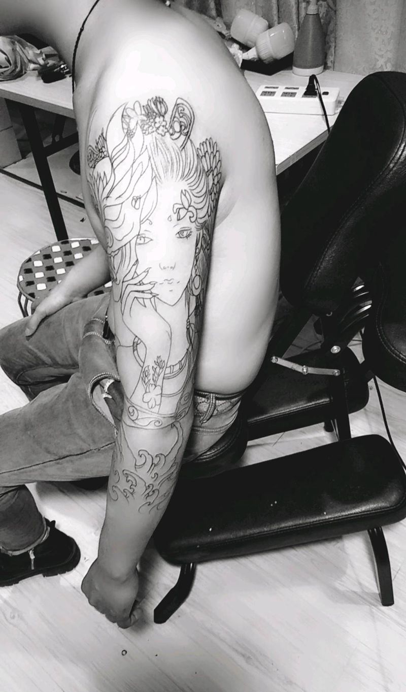 当前位置: 首页 >云南省曲靖市纹身店-金艺神刺工作室纹身图案>艺妓 线条纹身图片_手臂纹身图案