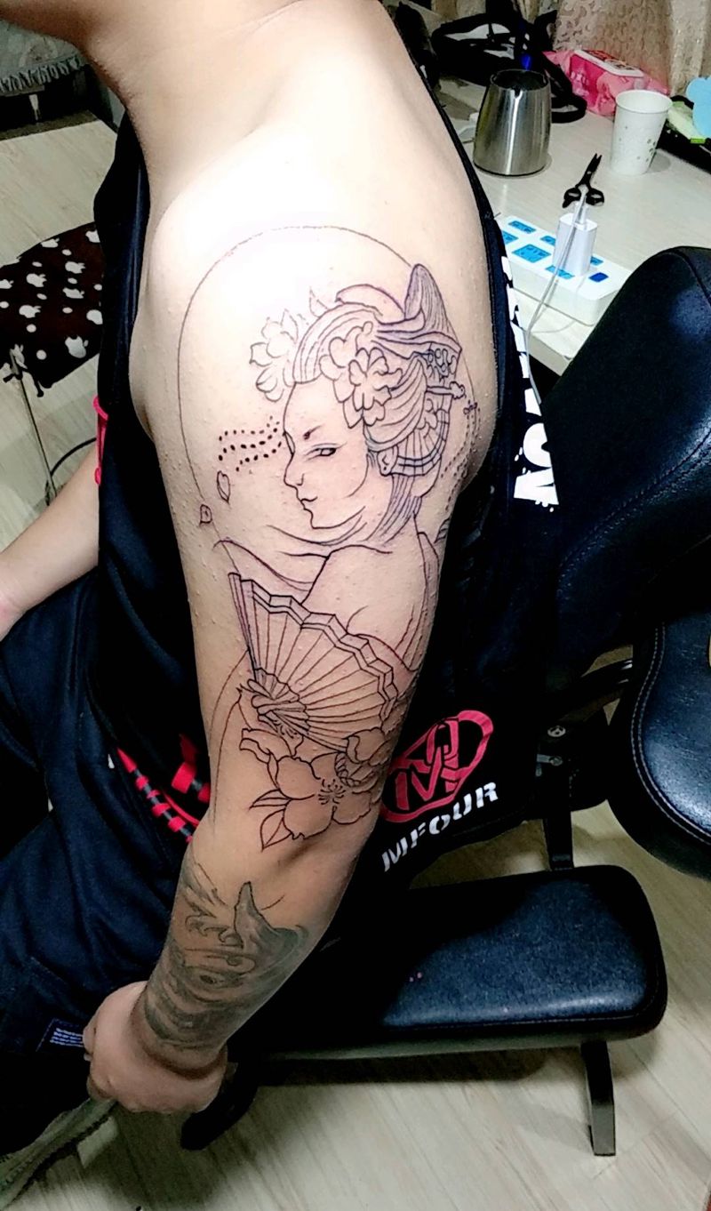 当前位置: 首页 >云南省曲靖市纹身店-金艺神刺工作室纹身图案>艺妓 线条纹身图片_手臂新传统纹身图案