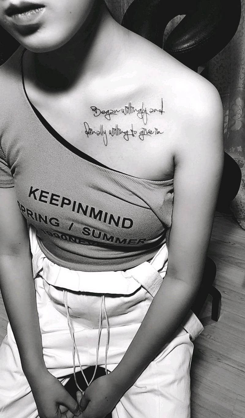 当前位置: 首页 >云南省曲靖市纹身店-金艺神刺工作室纹身图案>锁骨英文纹身图片_胸部花体字点刺纹身图案