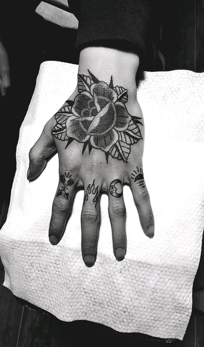 • 手背潮流时尚的玫瑰花眼睛纹身图案