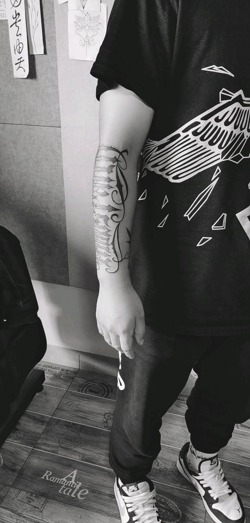 当前位置: 首页 >云南省曲靖市纹身店-金艺神刺工作室纹身图案>花体字纹身图片_手臂花体字纹身图案