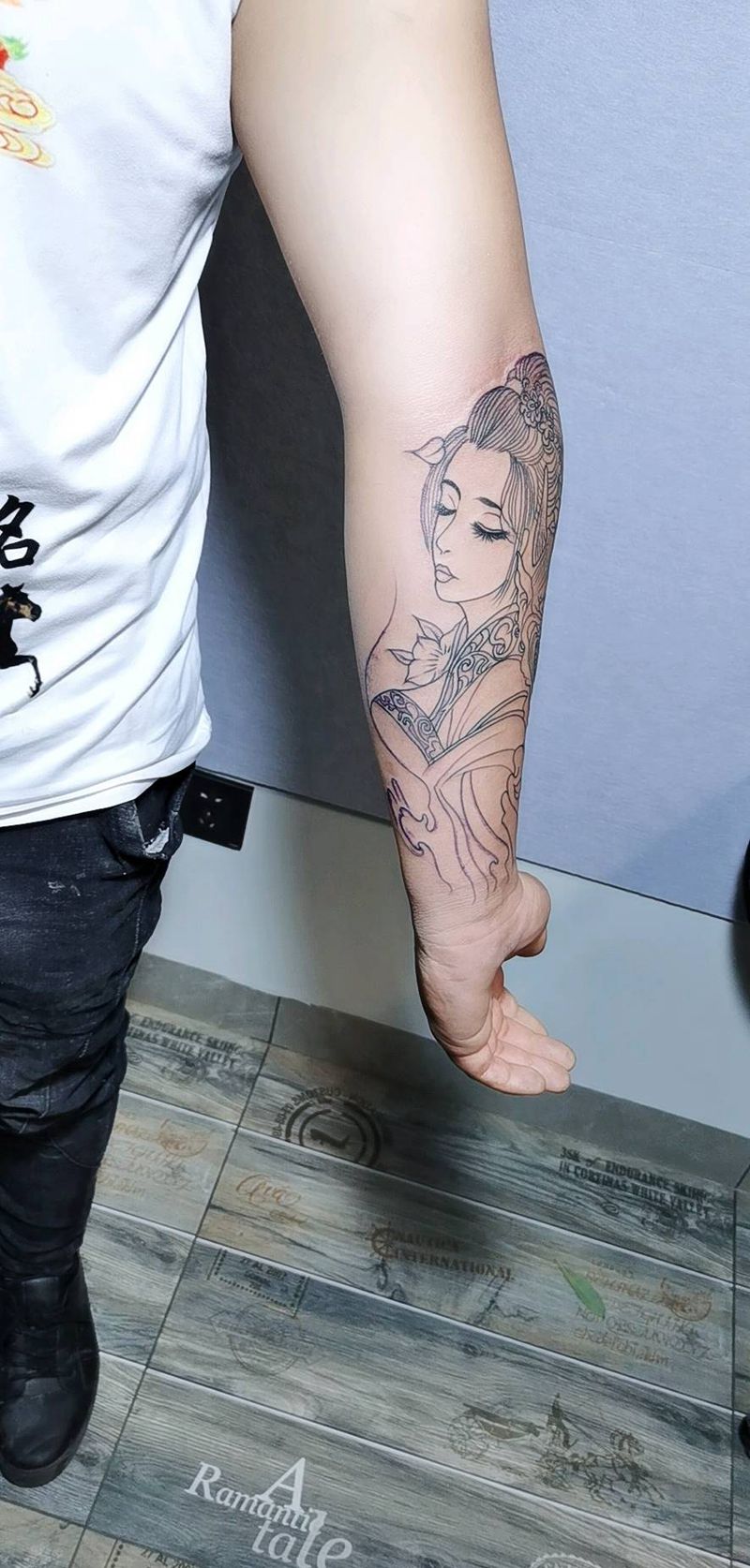 当前位置: 首页 >云南省曲靖市纹身店-金艺神刺工作室纹身图案>艺妓 线条纹身图片_手臂纹身图案