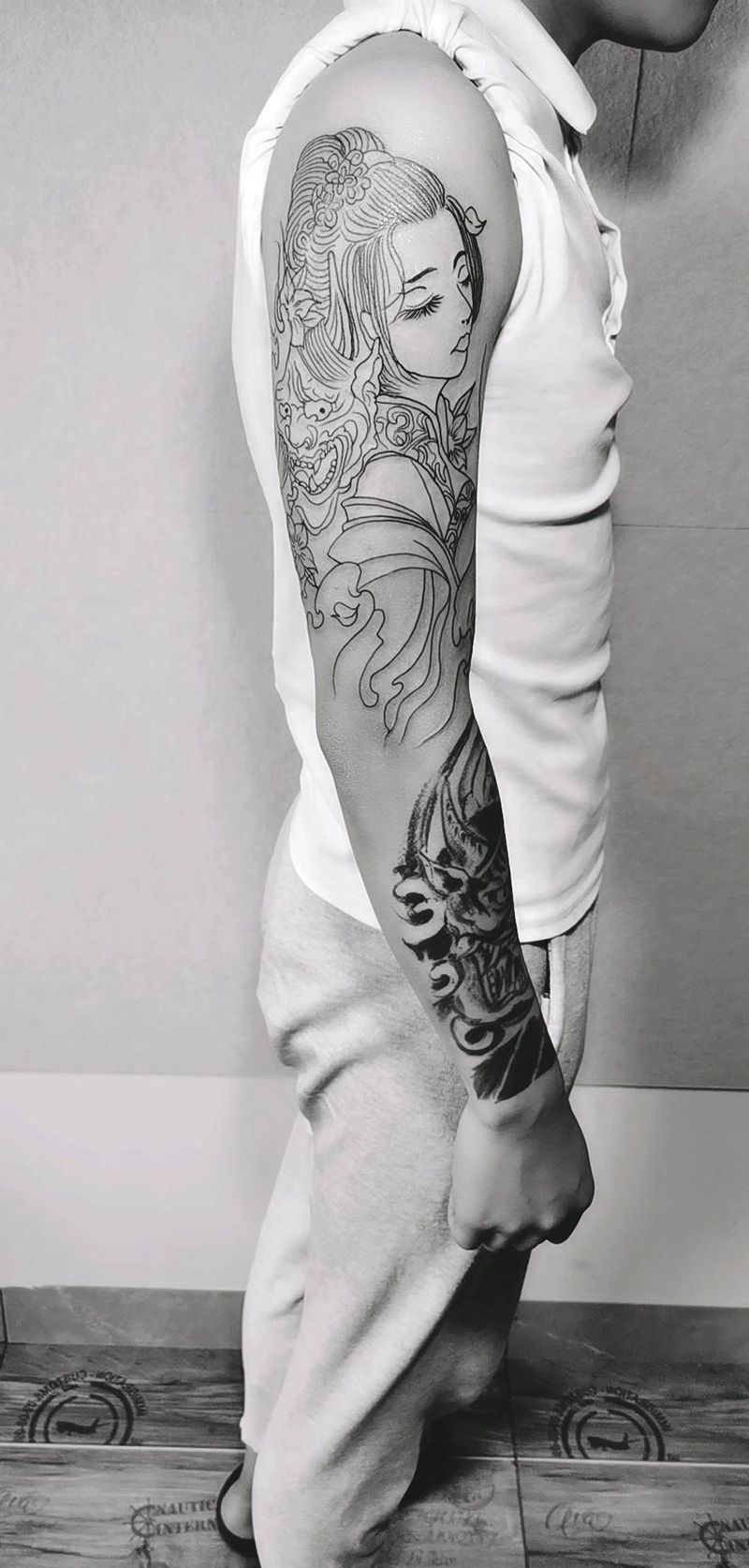 当前位置: 首页 >云南省曲靖市纹身店-金艺神刺工作室纹身图案>大臂 艺妓 线条纹身图片_手臂纹身图案
