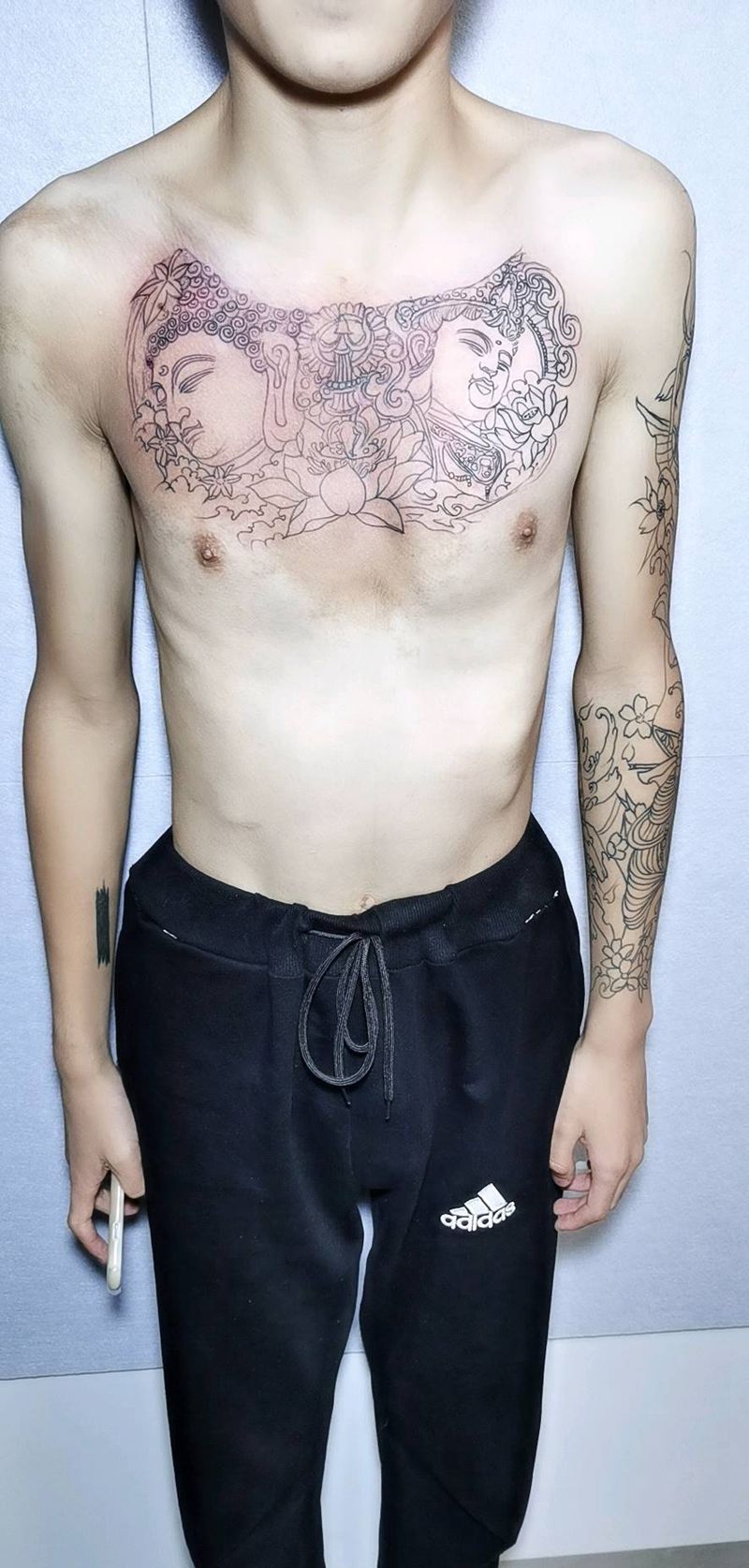 当前位置: 首页 >云南省曲靖市纹身店-金艺神刺工作室纹身图案>两面佛 花胸 线条遮盖胎记纹身图片_胸部纹身图案