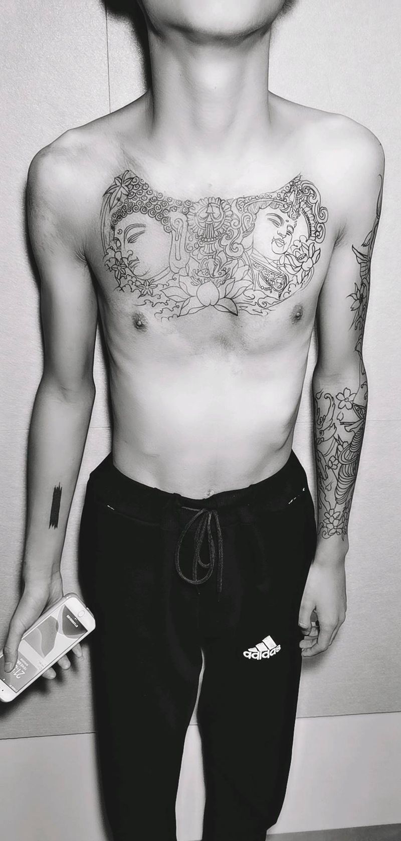 当前位置: 首页 >云南省曲靖市纹身店-金艺神刺工作室纹身图案>两面佛 花胸 线条遮盖胎记纹身图片_胸部纹身图案